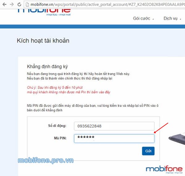 Bước 4: Lúc này, hệ thống sẽ gửi mã PIN về thuê bao qua sms, khách hàng mở tin nhắn để xem và nhập chính xác vào mục “Mã PIN“, sau đó bấm “Gửi” để kích hoạt tài khoản.
